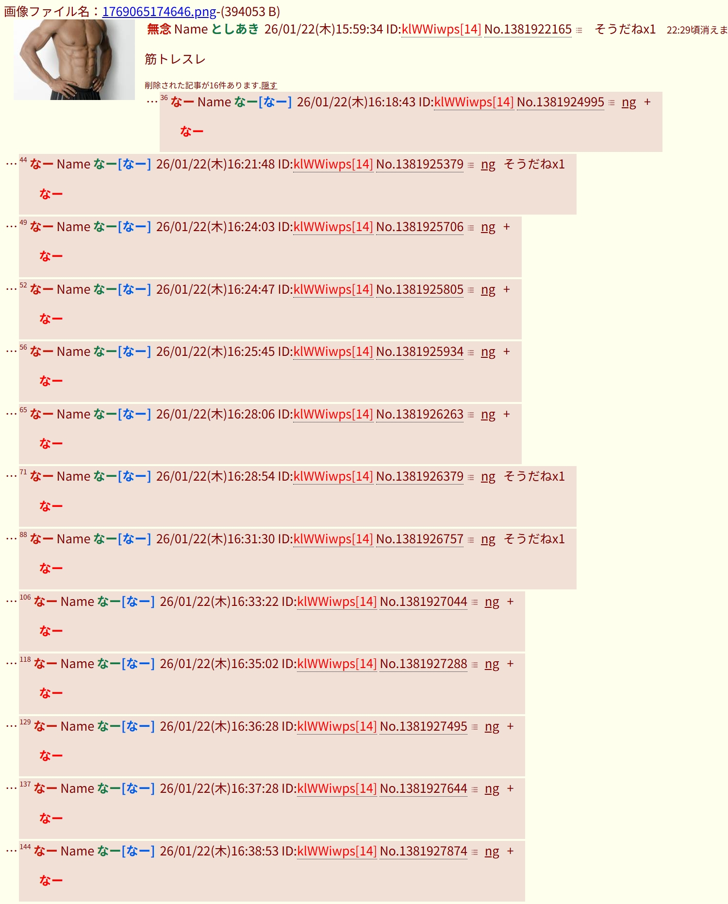 | … | 167無念Nameとしあき26/02/08(日)17:44:30No.1385849466+>筋トレスレだから筋肉の画像 |