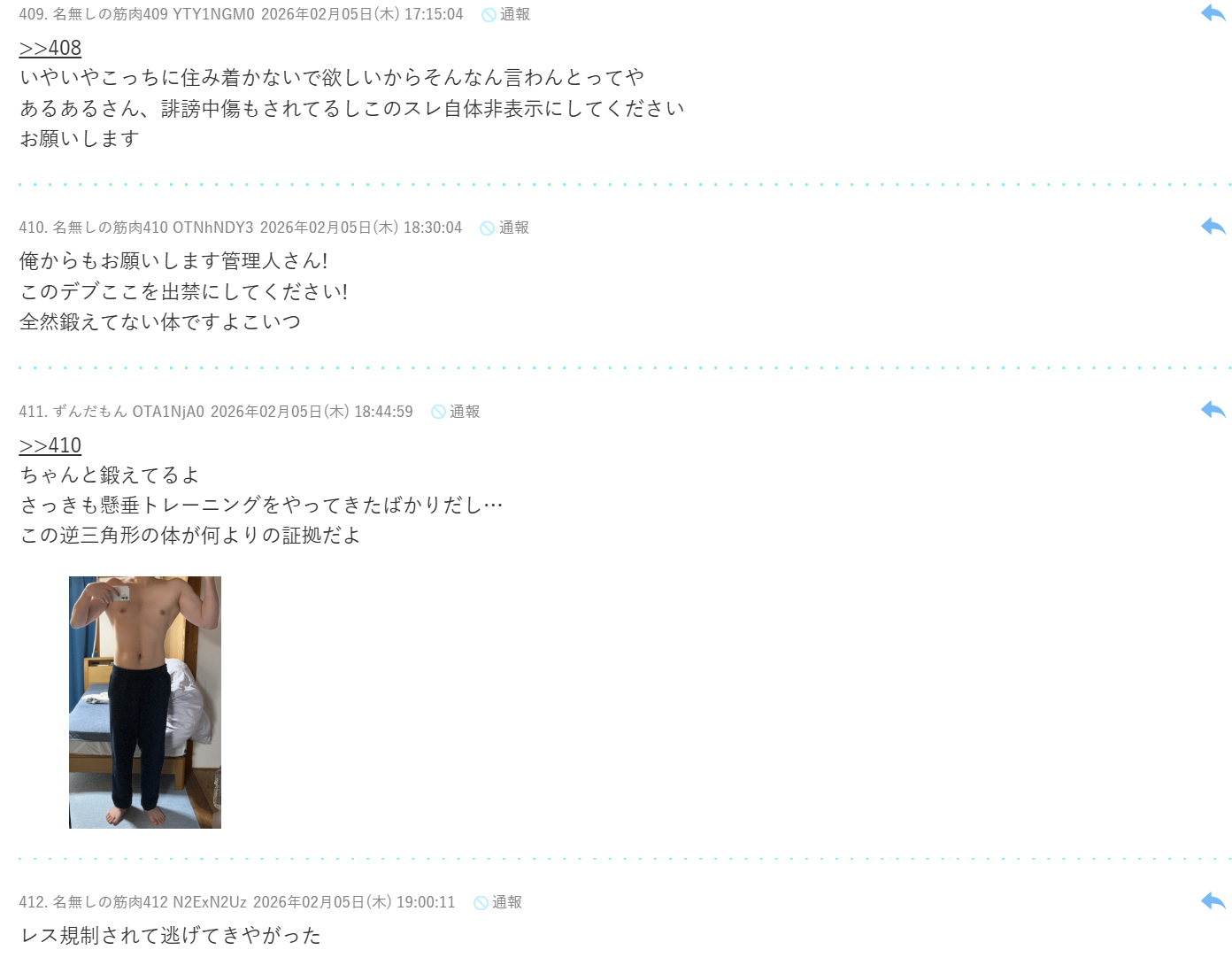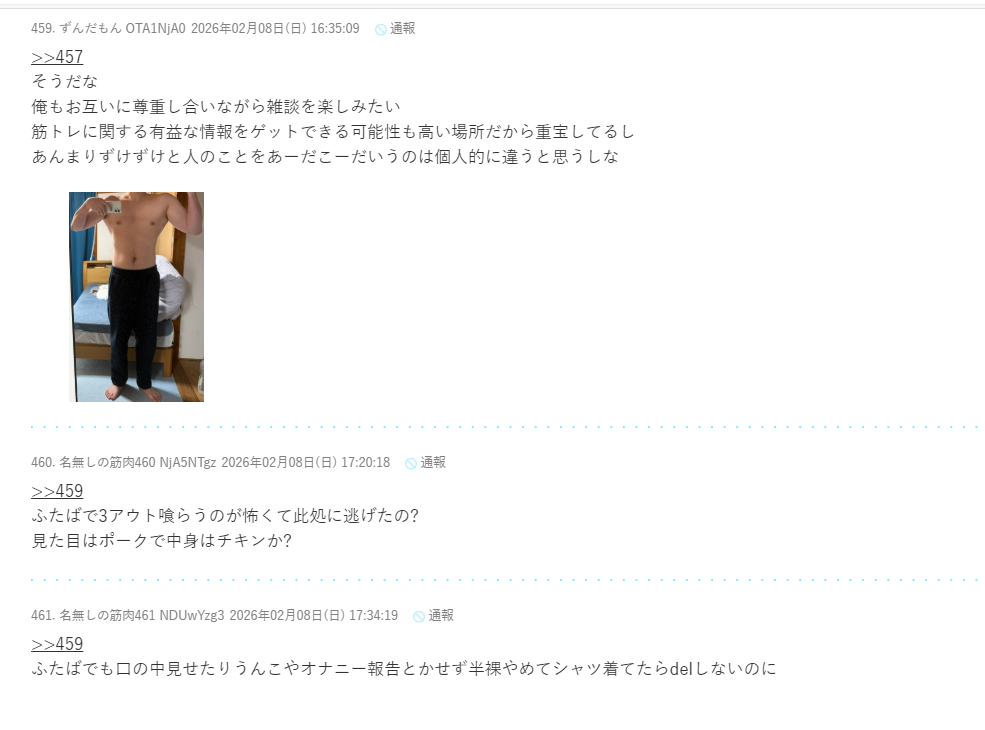 | … | 168無念Nameとしあき26/02/08(日)17:44:32 ID:r2c1iZw2No.1385849473+ 1770540272823.jpg-(1192487 B) >引き篭もりの筋トレほど何の役にも立たないものは無い |