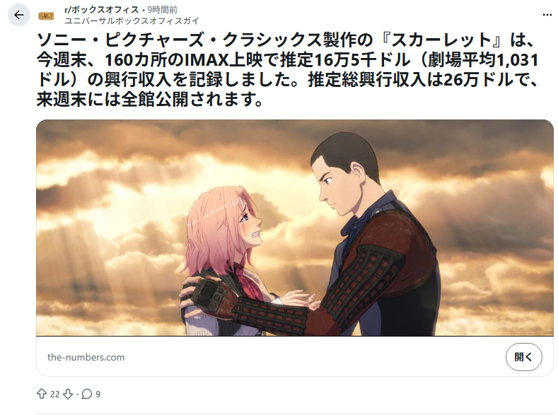 | … | 87無念Nameとしあき26/02/09(月)12:44:47No.1386111834+>北米初週は推定26万ドルの大ヒットスタート!! |