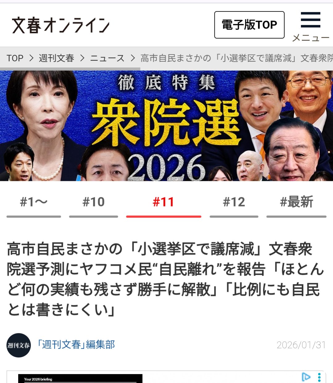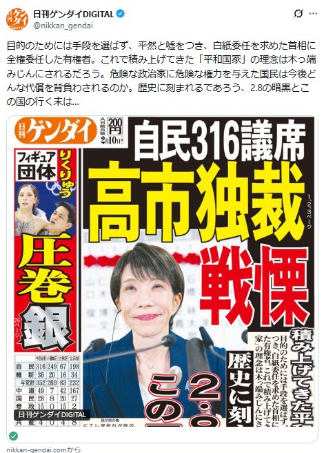 | … | 65無念Nameとしあき26/02/09(月)13:12:13No.1386117833そうだねx5文春も選挙当日に自民の悪口記事出してなかったっけ |