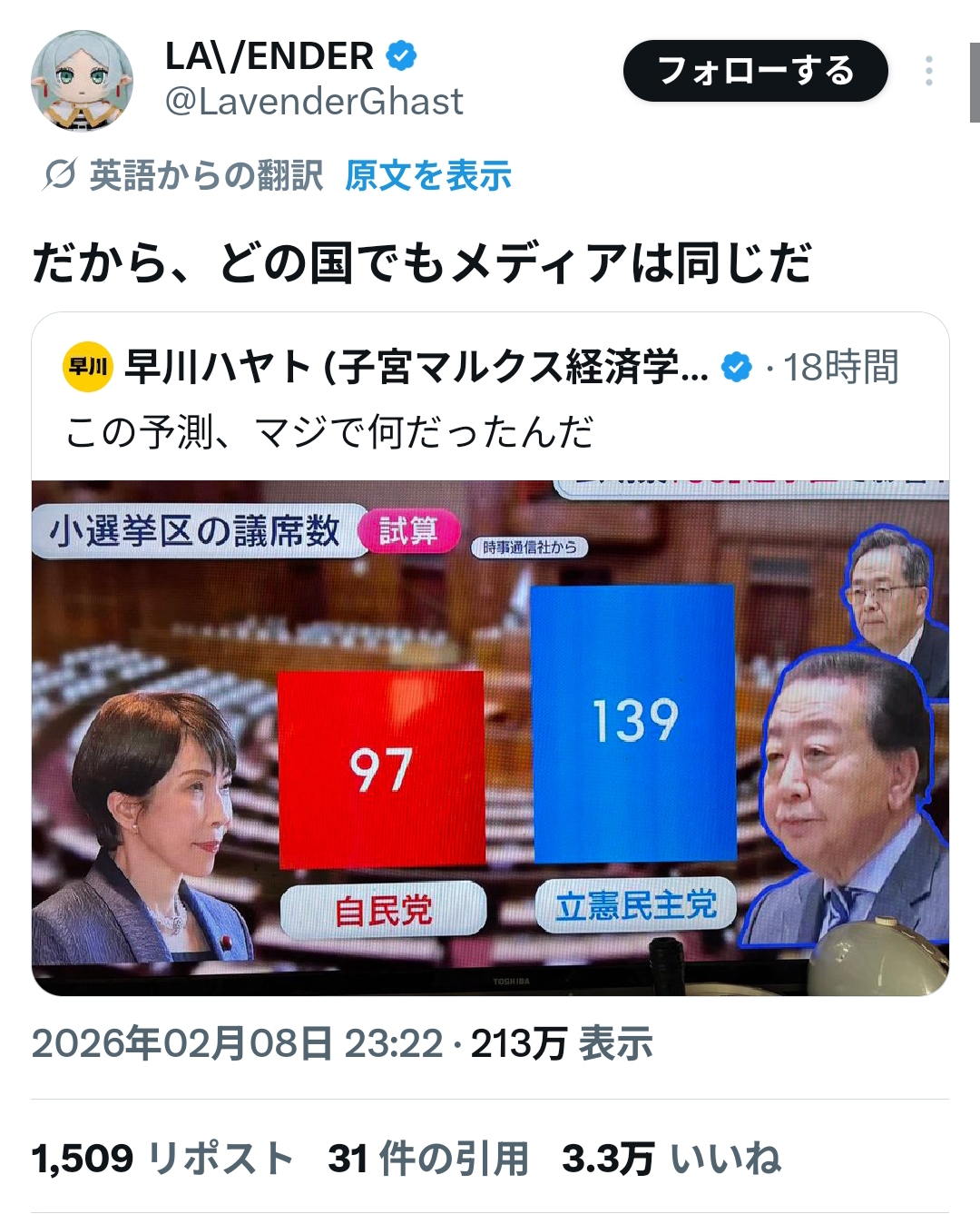 | … | 50無念Nameとしあき26/02/09(月)12:59:28No.1386115372+>ひるおびも必死で高市人気で勝っただけで自民党が支持されたわけじゃないアピールしとるな |