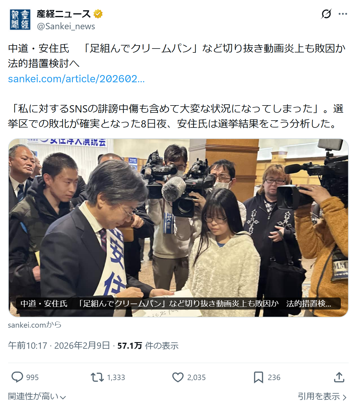 | … | 910無念Nameとしあき26/02/09(月)14:35:08No.1386132622+安易にSNSを使って選挙活動したのが悪い |