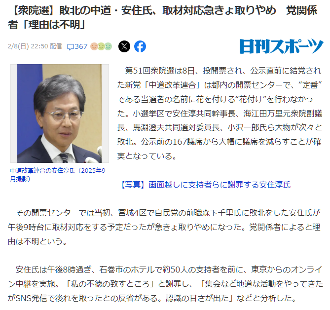 | … | 63無念Nameとしあき26/02/09(月)18:53:38No.1386182315+中道大優勢みたいな報道してたのに大敗した途端「実は○○で不利だった」とか言い出すのウケる |
