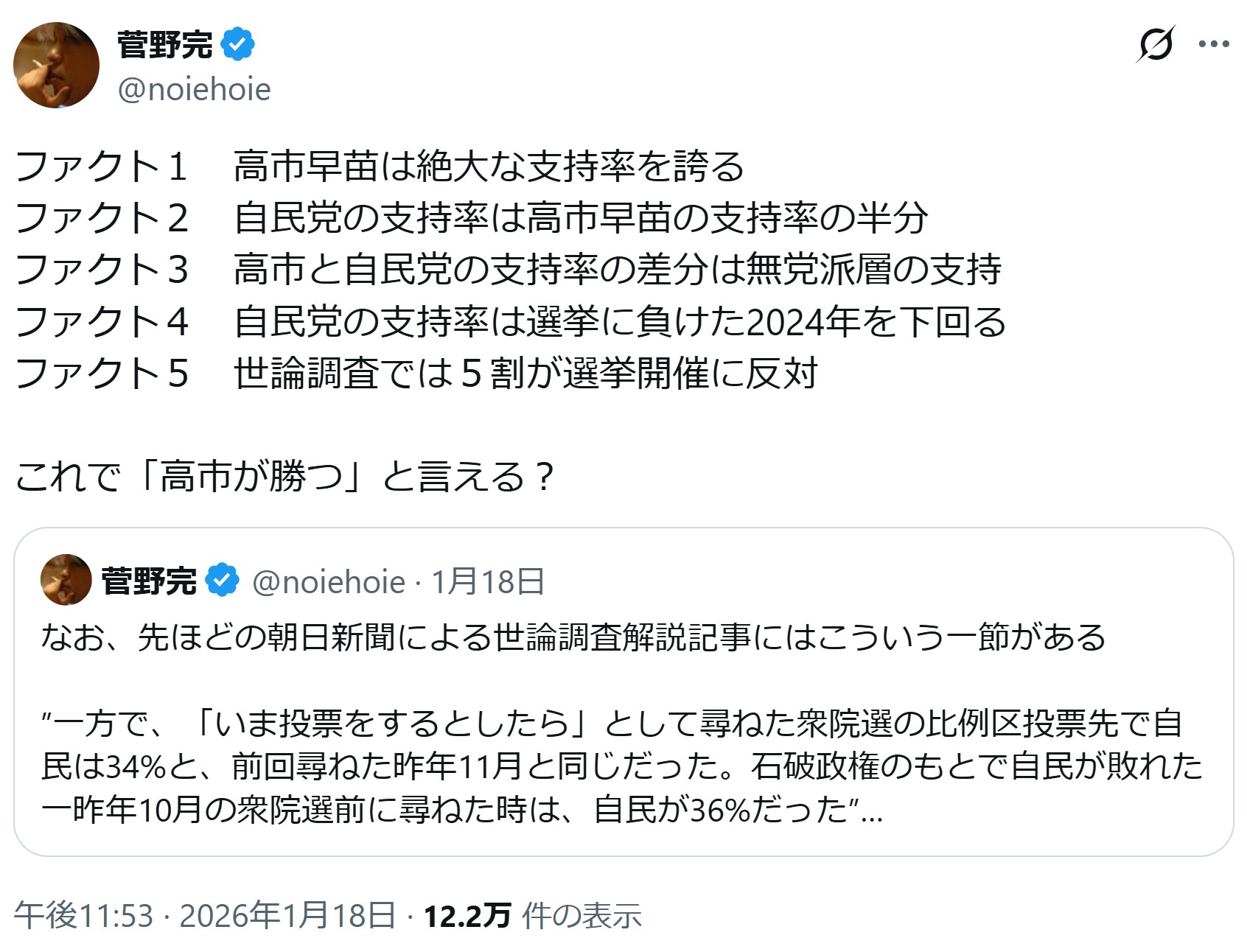 | … | 78無念Nameとしあき26/02/09(月)18:49:31No.1386181205+選挙近づいてきたらよっぽど乖離があったのか自民単独で300とか言い出したよな |