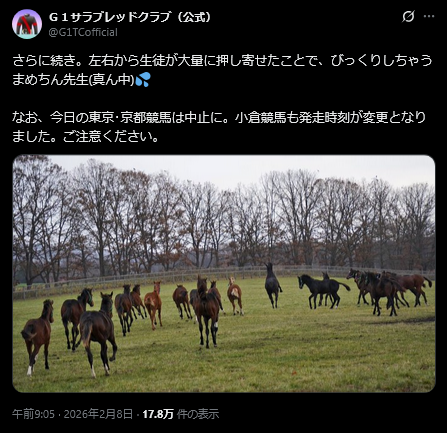 | … | 18無念Nameとしあき26/02/09(月)20:11:43No.1386205401+>明日こそ東京と京都のレースが無事やれますようにぽん |