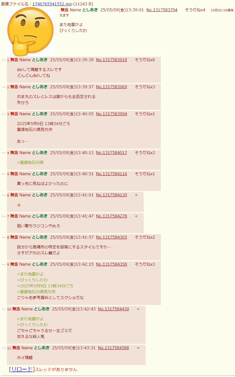 | … | 46無念Nameとしあき26/02/09(月)21:06:02No.1386221565+1〜2レス目の自演が早すぎて萎える |