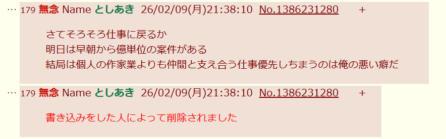 | … | 181無念Nameとしあき26/02/09(月)21:38:47No.1386231459そうだねx4>さてそろそろ仕事に戻るか |