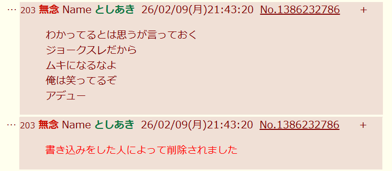 | … | 239無念Nameとしあき26/02/09(月)21:55:16No.1386236214そうだねx2>ムキになるなよ |