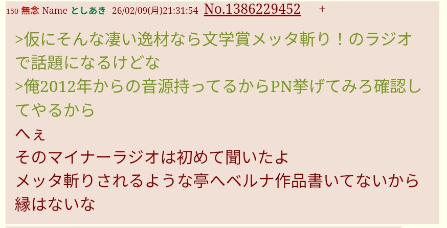| … | 206無念Nameとしあき26/02/09(月)21:43:29No.1386232839そうだねx2としあきたちの中にはガチの作家業やレビュアーなんかも混じってるが |