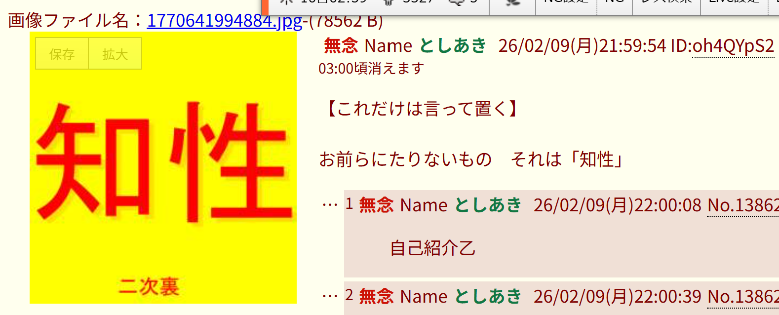 | … | 87無念Nameとしあき26/02/09(月)21:17:35No.1386225097+>しかしimgの連中は無能だな |
