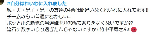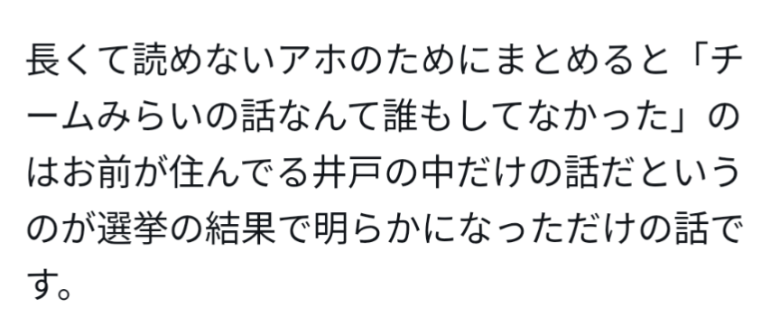 | … | 189無念Nameとしあき26/02/10(火)16:32:23No.1386369237+>みらいもれいわもひらがな三文字だから集計で不正されたとか喚く人見て草ですよ |