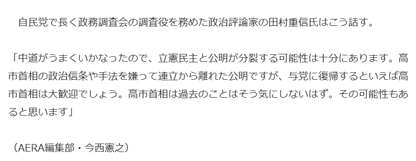 「中道がうまくいかなったので、立憲民主と公明が分裂する可能性は十分にあります。高市首相の政治信条や手法を嫌って連立から離れた公明ですが、与党に復帰するといえば高市首相は大歓迎でしょう。高市首相は過去のことはそう気にしないはず。その可能性もあると思います」削除された記事が1件あります.見る