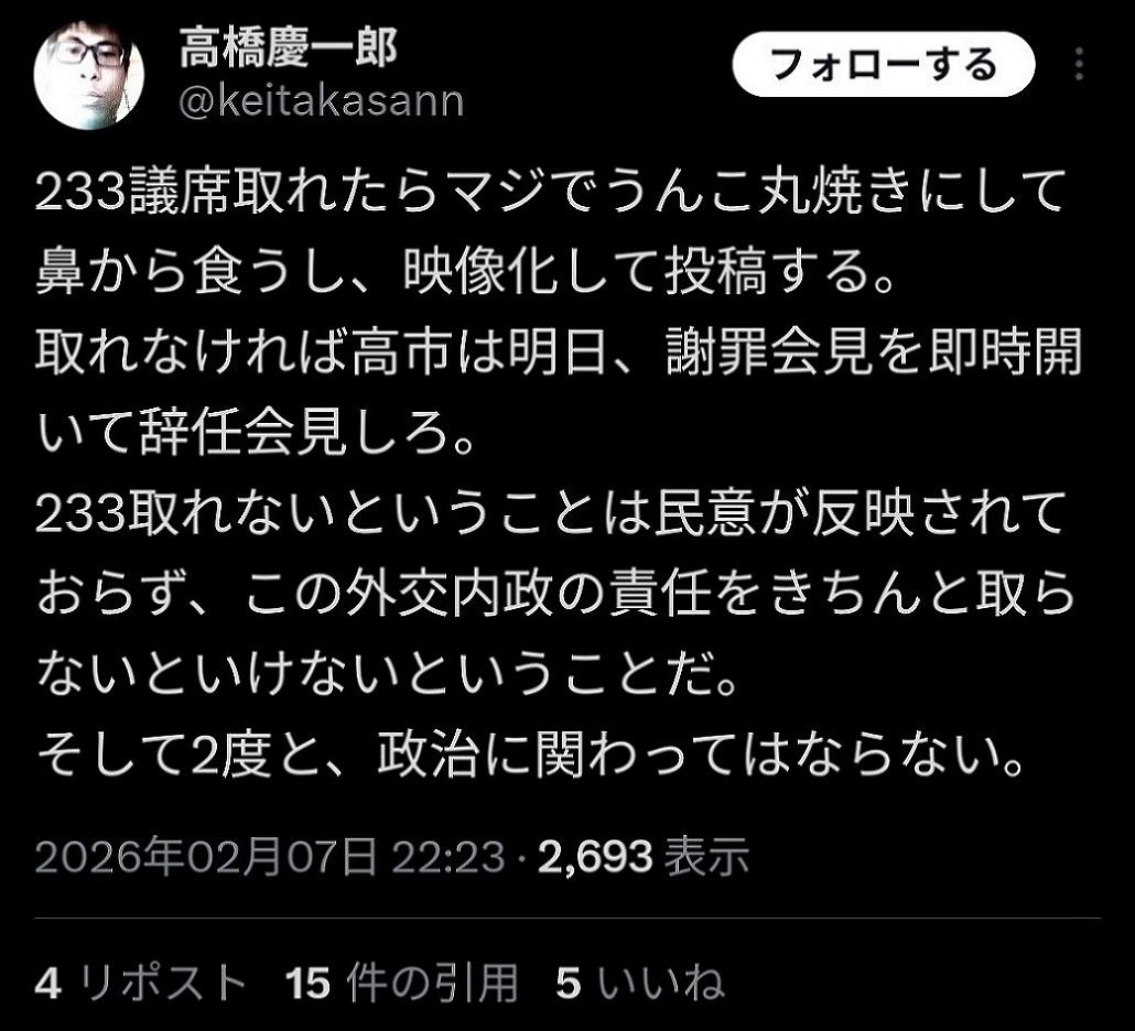 | … | 6無念Nameとしあき26/02/11(水)10:54:33No.1386546123そうだねx1自分がクソだって自覚は一応あるんだなスレ豚 |
