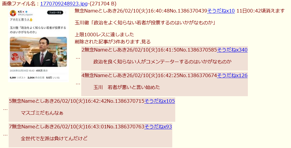 | … | 2無念Nameとしあき26/02/11(水)11:59:04No.1386559016+普通に立憲に戻って参院選の準備でしょ |