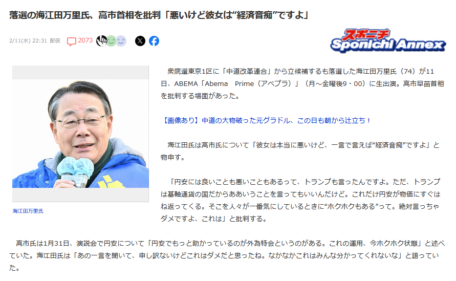 | … | 75無念Nameとしあき26/02/12(木)01:34:19No.1386753435+失業率高くて株価もゴミだった民主党に経済音痴って言われてもな… |