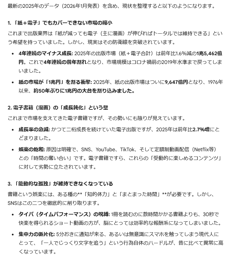 | … | 61無念Nameとしあき26/02/12(木)03:08:48No.1386759664+電子書籍が伸びてたのは紙からの買い直し需要が大きかったからなので |