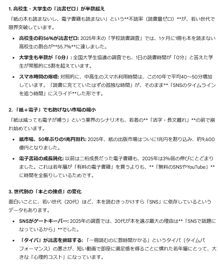 | … | 9無念Nameとしあき26/02/12(木)00:38:37No.1386745582そうだねx2>若年層が「有料の電子書籍」を買うよりも「無料のSNSやYouTube」に時間を全振りしているため |