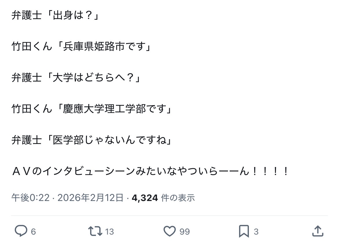| … | 43無念Nameとしあき26/02/12(木)14:10:44No.1386823338+竹田くんは裁判起こしたり起こされたりで凄いよね… |