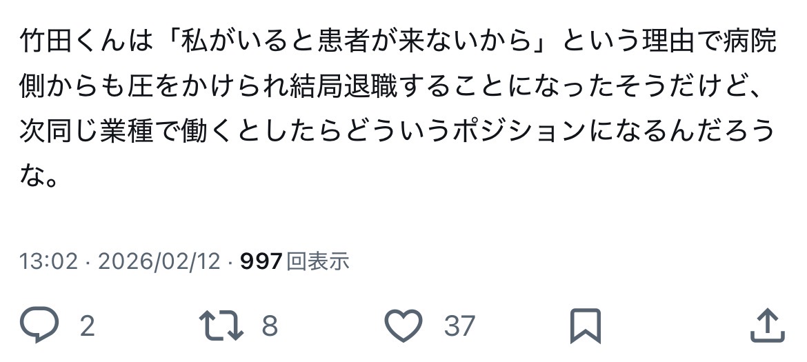 | … | 85無念Nameとしあき26/02/12(木)15:08:59No.1386832015+竹田くん見て担当医の名前をチェックするようになったな… |