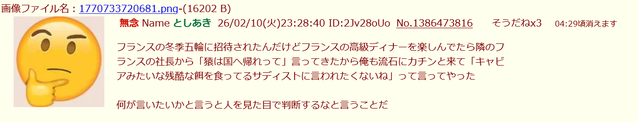 | … | 145無念Nameとしあき26/02/12(木)15:20:08No.1386833841そうだねx4>>No.1386820298 |