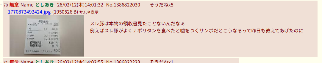 | … | 27無念Nameとしあき26/02/12(木)13:53:08No.1386820691そうだねx11レシート見たこと無いんかなスレ豚君 |
