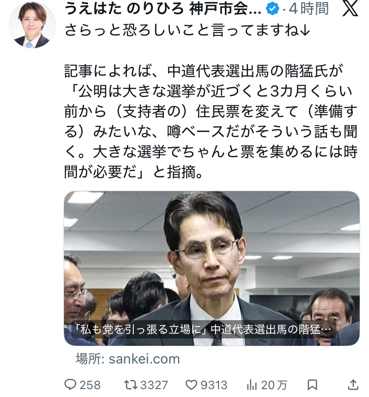 | … | 69無念Nameとしあき26/02/12(木)14:44:34No.1386828242そうだねx3> 米山氏は「2度目の敗軍の将の野田氏に『A級戦犯だ』…中道への合流『自滅しにいくようなものだ』との声も」との見出しの記事を引用。「148議席から100議席に減るのを回避しようとして、『抜き打ち直前合併』という奇策を打った上、中道改革連合という余りに無茶な党名を筆頭に多々セオリーに反する選挙戦術を展開して48議席の大敗を喫した事は事実です」とした上で「何故この様な無茶が通ったのかそれは失敗の研究が必要です」と訴えた。 |