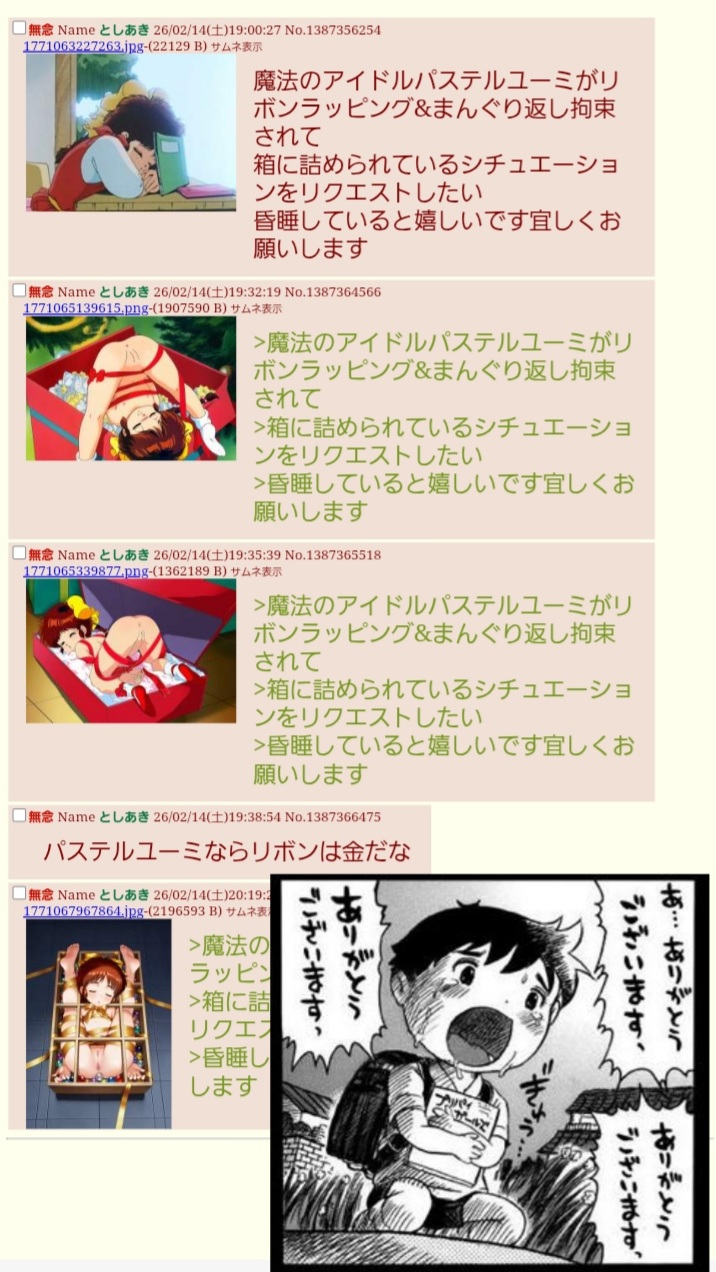 | … | 42無念Nameとしあき26/02/14(土)20:28:21No.1387381200+ 1771068501229.jpg-(258173 B) >>魔法のアイドルパステルユーミがリボンラッピング&まんぐり返し拘束されて |