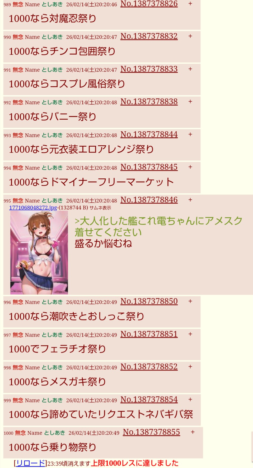 | … | 980無念Nameとしあき26/02/14(土)23:09:46No.1387433849+1000ならWフェラ祭り |