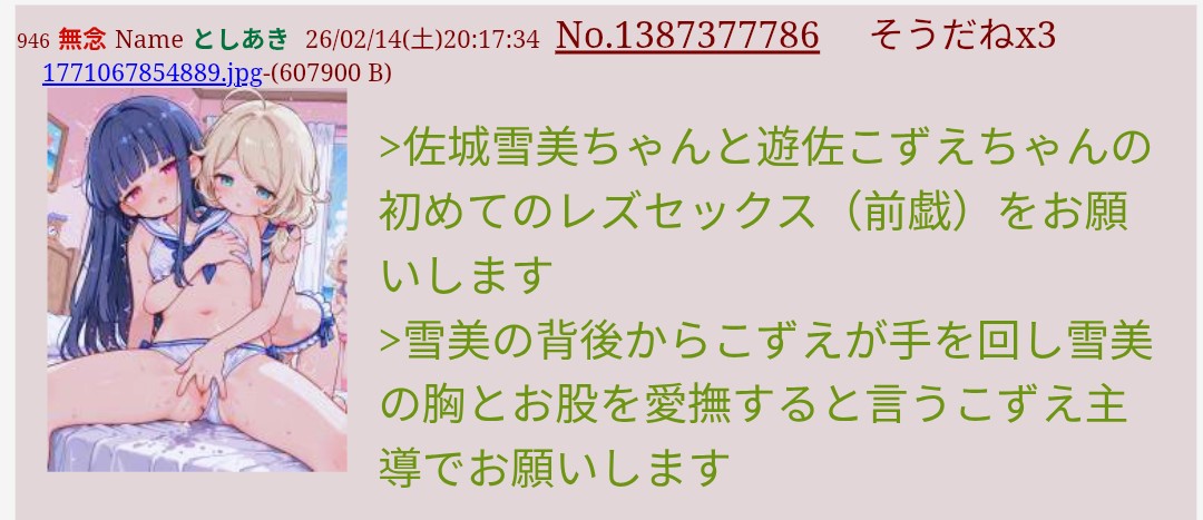 | … | 75無念Nameとしあき26/02/14(土)20:30:56No.1387382047+ショタと寝バックでしてるラブライブの絢瀬絵里お願いします |