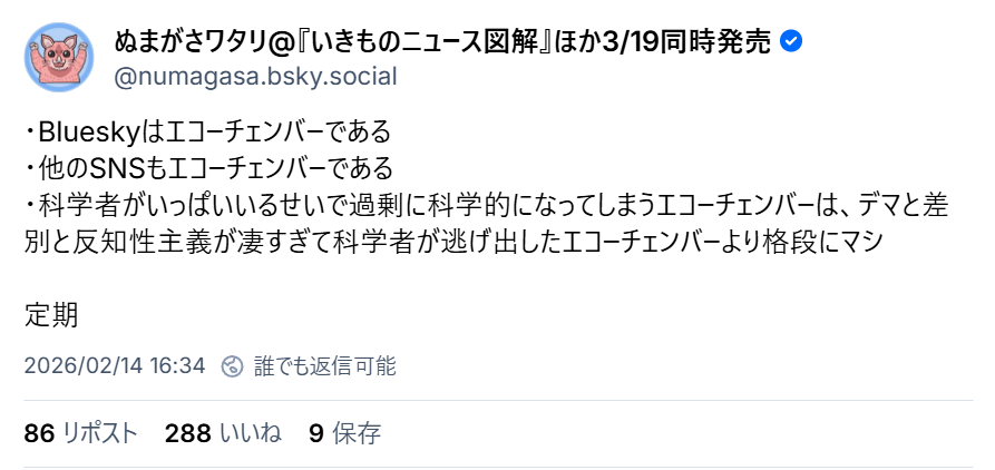 | … | 7無念Nameとしあき26/02/14(土)20:44:37No.1387386444そうだねx17自分以外が全員バカに見えてる自称インテリ笑がリベラルの名を借りた選民思想ごっこだからね |