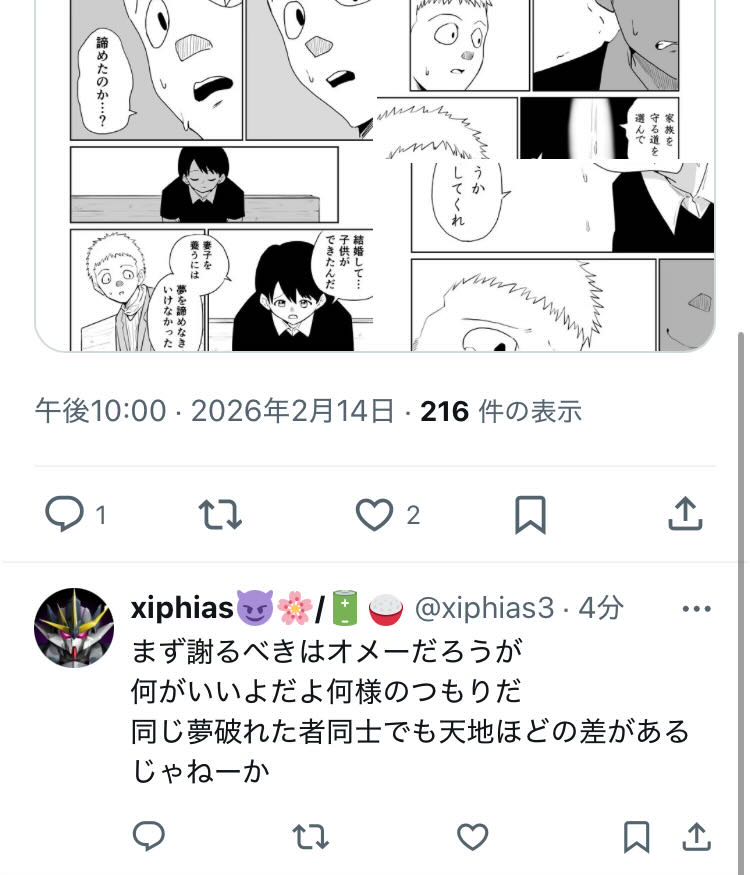 | … | 931無念Nameとしあき26/02/14(土)23:21:42No.1387437174そうだねx8こ…こいつ夢を諦めてやがる…しかも結婚して妻子だと!? |