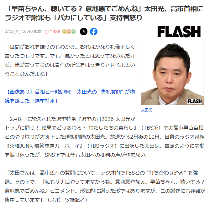 | … | 78無念Nameとしあき26/02/14(土)23:29:47No.1387439332そうだねx3「お笑いは権力者を揶揄してナンボ」幻想 |