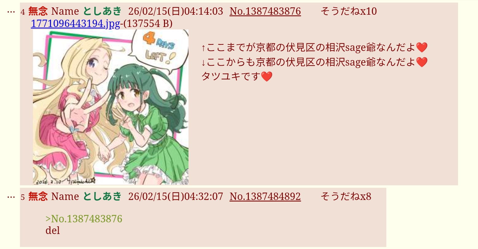 | … | 4無念Nameとしあき26/02/15(日)04:14:03No.1387483876そうだねx10 1771096443194.jpg-(137554 B) ↑ここまでが京都の伏見区の相沢sage爺なんだよ❤️ |