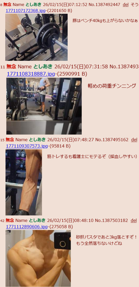 | … | 317無念Nameとしあき26/02/15(日)19:46:40No.1387662167そうだねx3>あいつジムで鍛えてる感じの画像とかつかわないよね |