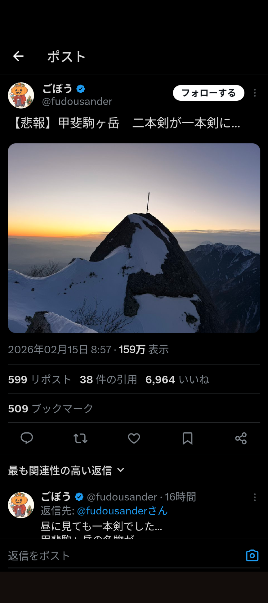 | … | 31無念Nameとしあき26/02/16(月)22:40:03 ID:uNfymOVUNo.1387932992+ 1771249203152.png-(535860 B) 度重なる強風で山頂に刺さってた刀の1本が抜けて転がり落ちたらしい |