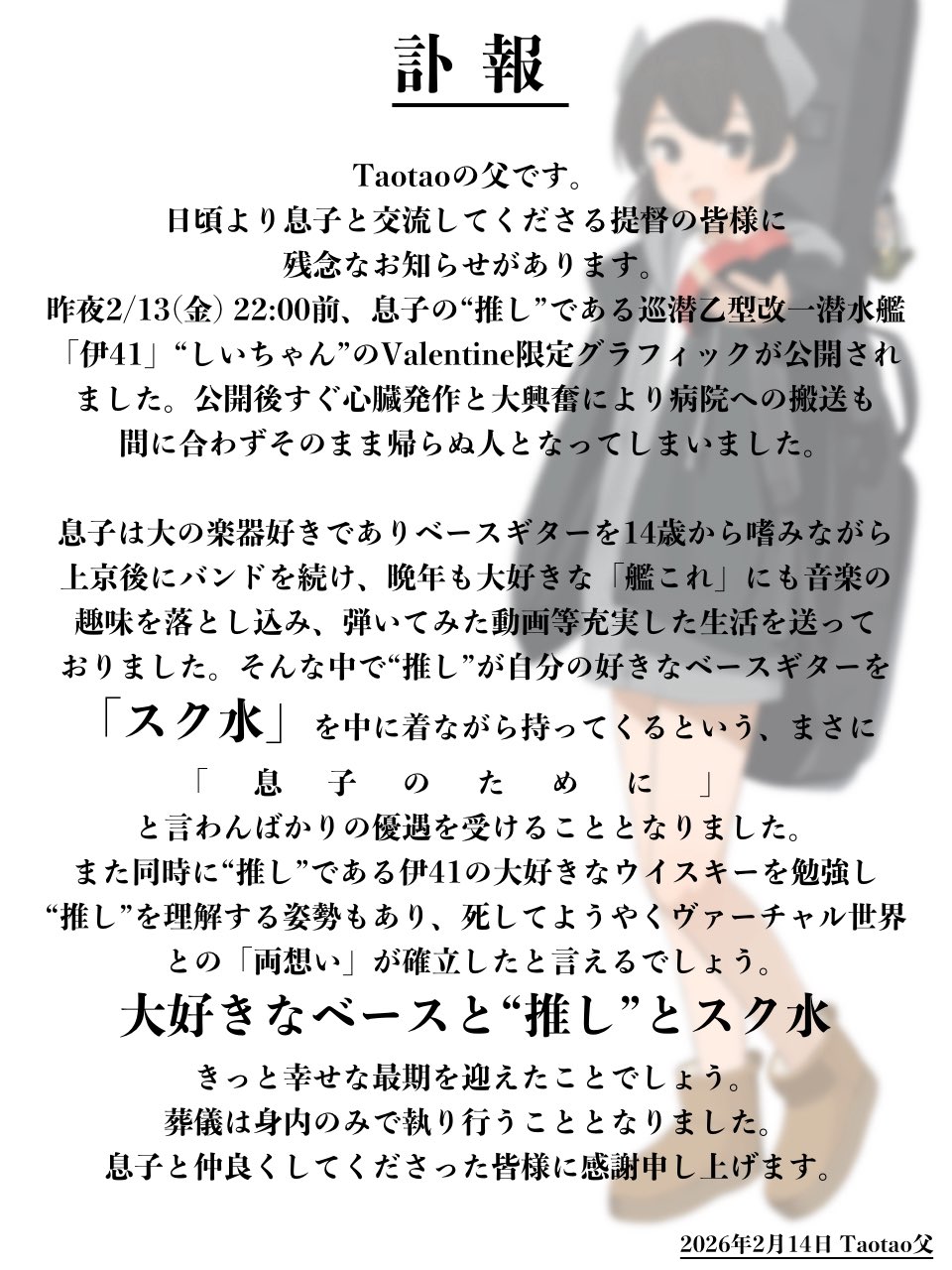 | … | 42無念Nameとしあき26/02/16(月)23:14:38 ID:uNfymOVUNo.1387942653+文字通り命を賭けて推し続けたと考えると一人のオタクとして複雑な気持ちになれるな |