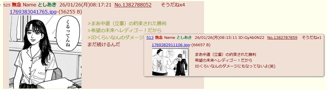 | … | 80無念Nameとしあき26/02/17(火)01:16:23No.1387966235+微妙に端末管理間違ってるよID出てる方をネトウヨ叩きで徹底しないと |