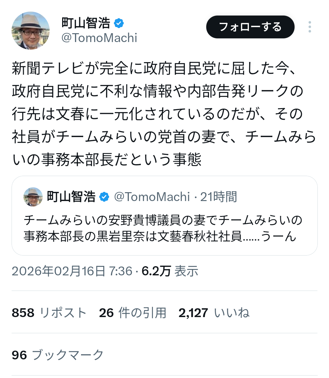 | … | 5無念Nameとしあき26/02/16(月)23:31:14No.1387947213そうだねx3みらいの応援ありがとう町山さん |