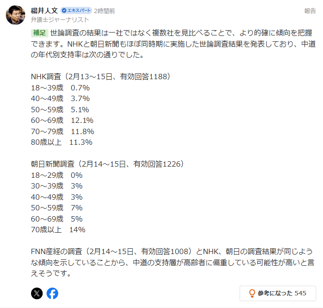 | … | 20無念Nameとしあき26/02/17(火)01:10:37No.1387965643+逆に表で中道支持してる40代以下が凄いマイノリティ扱いに… |