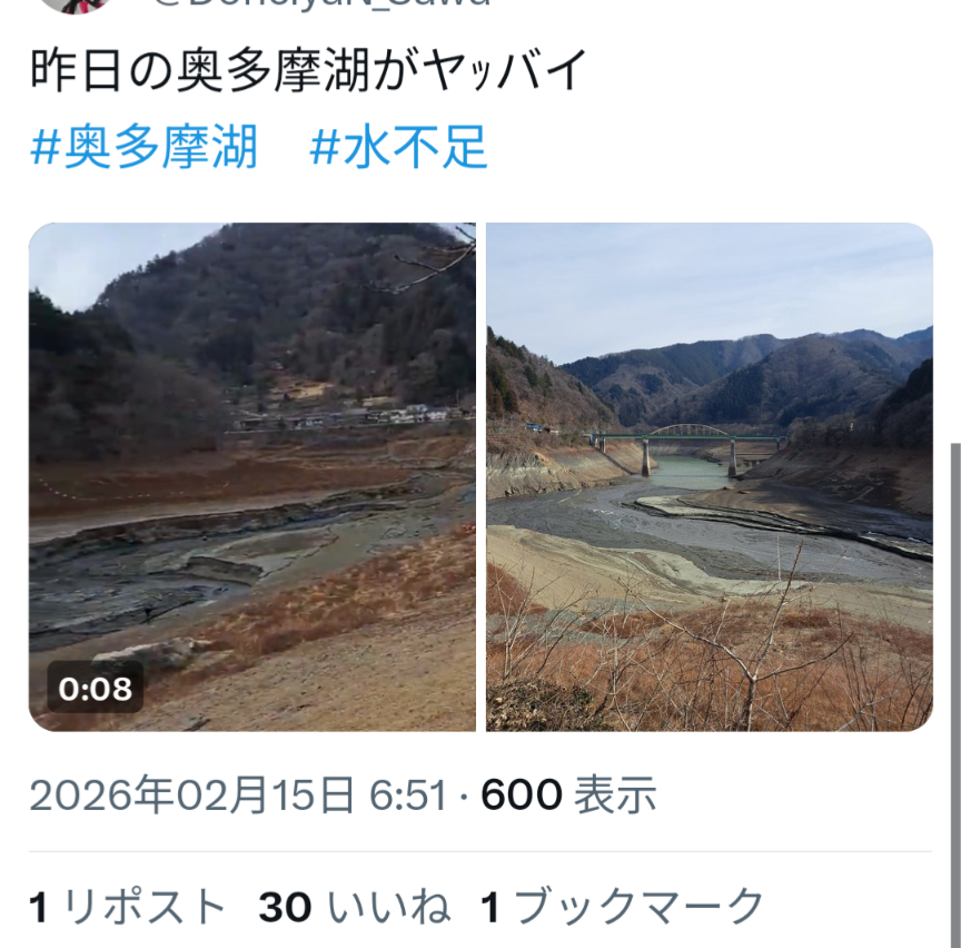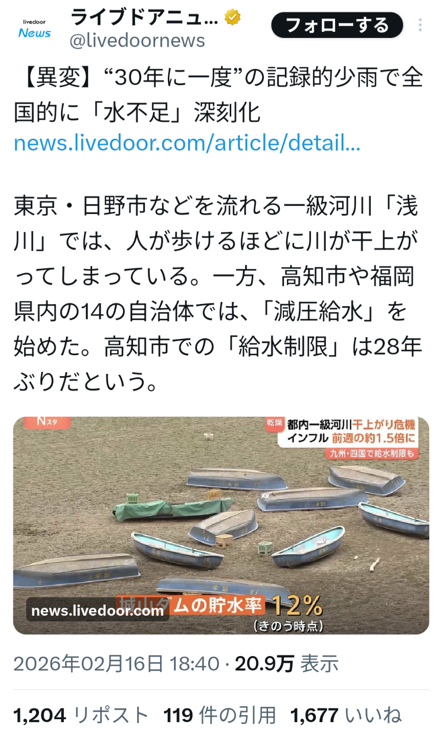 | … | 47無念Nameとしあき26/02/17(火)09:10:48No.1387992315そうだねx3過去に一度渇水があって追加でダム建設予定立ってたけど反対で白紙になってそのまま水不足に |