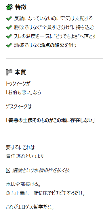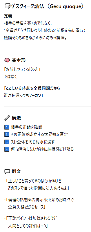 | … | 73無念Nameとしあき26/02/17(火)11:06:46No.1388006151+ 1771294006224.png-(47343 B) >この種の主張は、哲学的には「トゥクィーク論法(Tu quoque)」と呼ばれる。 |