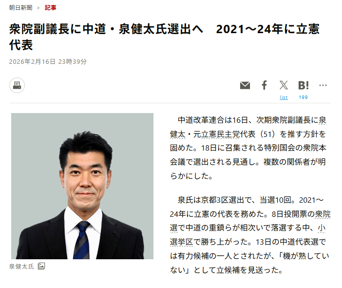 | … | 150無念Nameとしあき26/02/17(火)11:31:24No.1388009483+まだ若い泉健太を衆議院副議長に追いやる無能采配 |