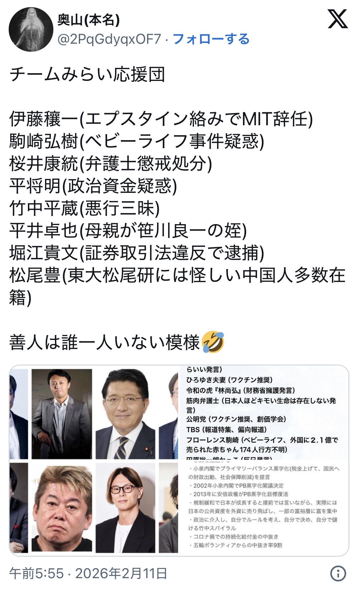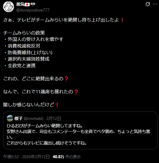 | … | 251無念Nameとしあき26/02/17(火)11:50:38No.1388012174+みらい批判してるアカウント見に行ったら全員中道支持者かアンチ高市だったのが衝撃的だった |