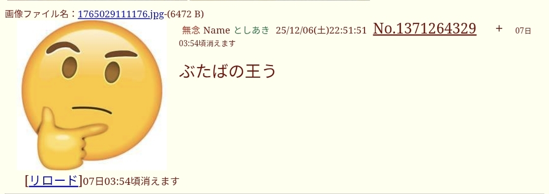 | … | 72無念Nameとしあき26/02/18(水)07:51:26No.1388195381+一回ブヒッと鳴く都度新しいクソスレを立てないで |