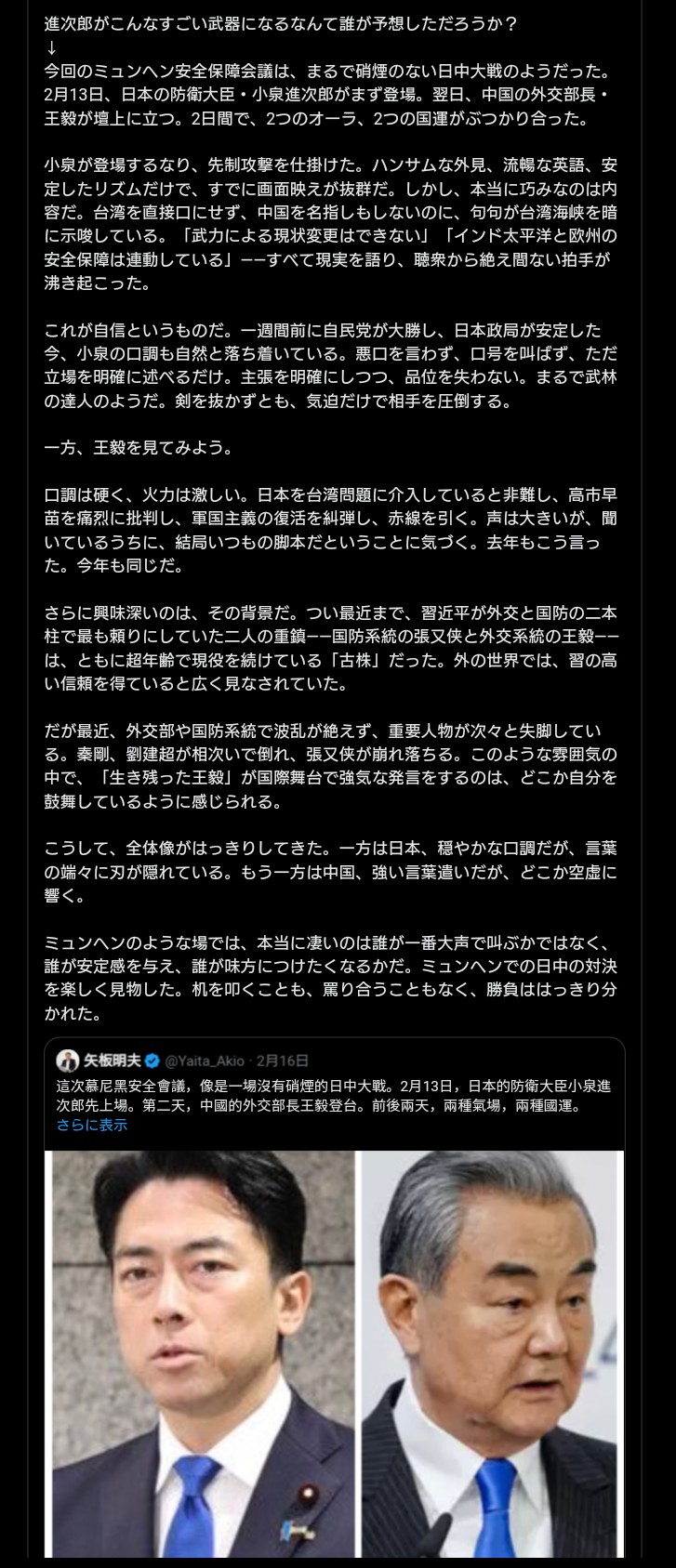 | … | 19無念Nameとしあき26/02/18(水)11:06:23No.1388217531そうだねx5 1771380383185.jpg-(316570 B) こうして、全体像がはっきりしてきた。一方は日本、穏やかな口調だが、言葉の端々に刃が隠れている。もう一方は中国、強い言葉遣いだが、どこか空虚に響く。 |