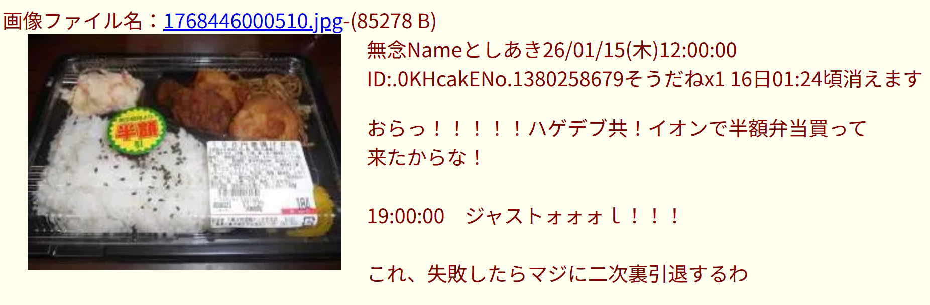 | … | 8無念Nameとしあき26/02/18(水)19:01:30No.1388294102そうだねx11>イオンで半額弁当買って来たからな! |