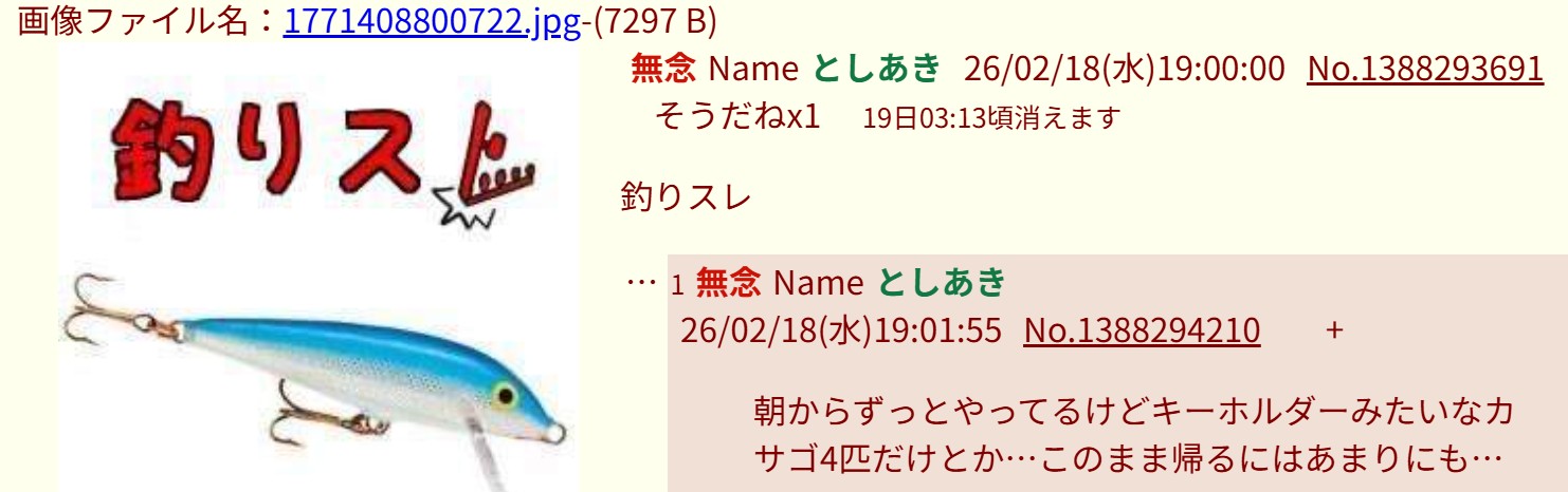 | … | 18無念Nameとしあき26/02/18(水)19:08:02No.1388295758そうだねx12>また釣りスレに負けとる |