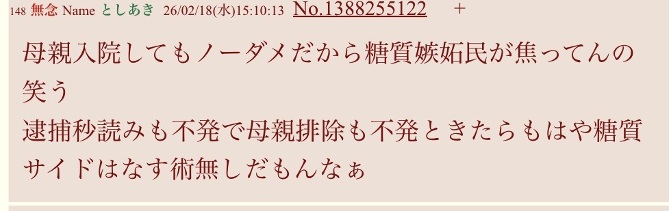 | … | 42無念Nameとしあき26/02/18(水)19:15:43No.1388297721そうだねx2ソンキくんにとっては入院するママよりこのスレ立てる方が大事なのね… |