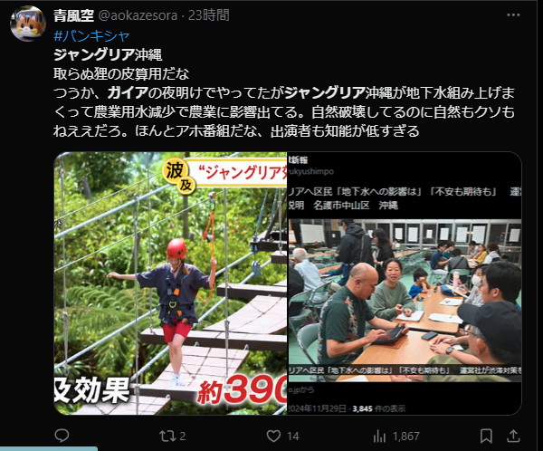 | … | 294無念Nameとしあき26/02/19(木)00:52:41No.1388383971そうだねx1>沖縄の自然を破壊して作った余命1年のテーマパークです! |