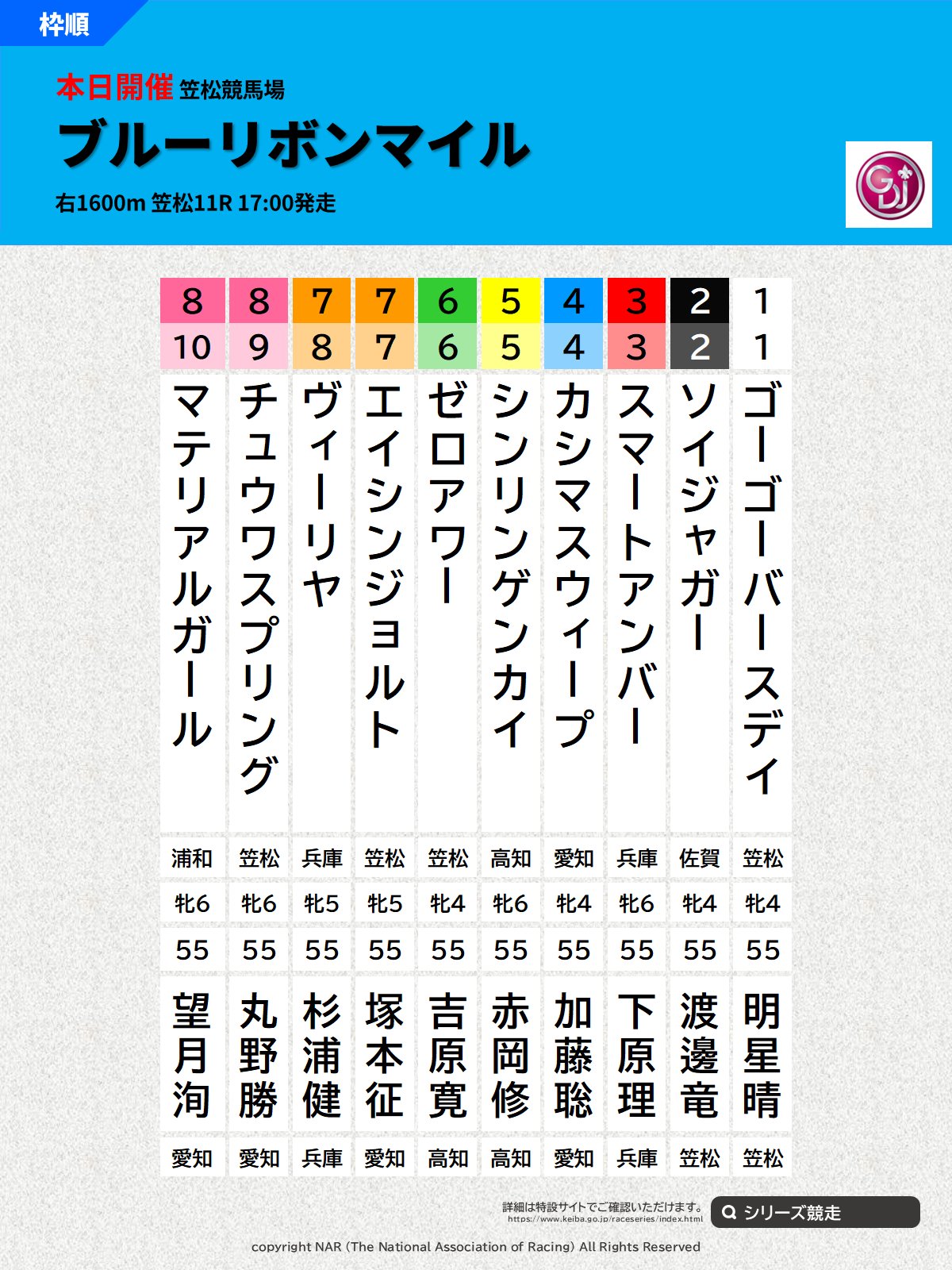 | … | 37無念Nameとしあき26/02/19(木)11:47:20No.1388434726そうだねx6 1771469240219.png-(119649 B) >#ブルーリボンマイル 本日開催。笠松競馬場で第3回ブルーリボンマイル(4歳上牝・右1600m)が行われます。発走は17時00分。 |